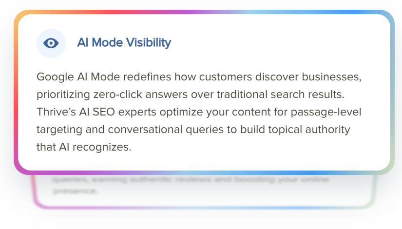 While many businesses are only now discovering the power of AI search, Thrive has been testing, refining, and leveraging it for months. That early experience fuels ThriveAI — a suite of advanced tools designed to keep your brand ahead of the competition. ThriveAI helps position your business to be recommended across major AI search platforms like ChatGPT, Gemini, Google AI Overviews, AI Mode, and more. By combining human expertise with intelligent AI insights, Thrive boosts your visibility, strengthens your authority, enhances brand sentiment, and connects you with high-intent audiences.