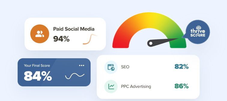 The Thrive Score is an in-depth assessment system created to measure a client’s overall digital marketing performance. Using a detailed scoring framework with more than 150 data points, it analyzes how well their current strategy is working, reveals key strengths, and uncovers areas where improvements can drive better results.